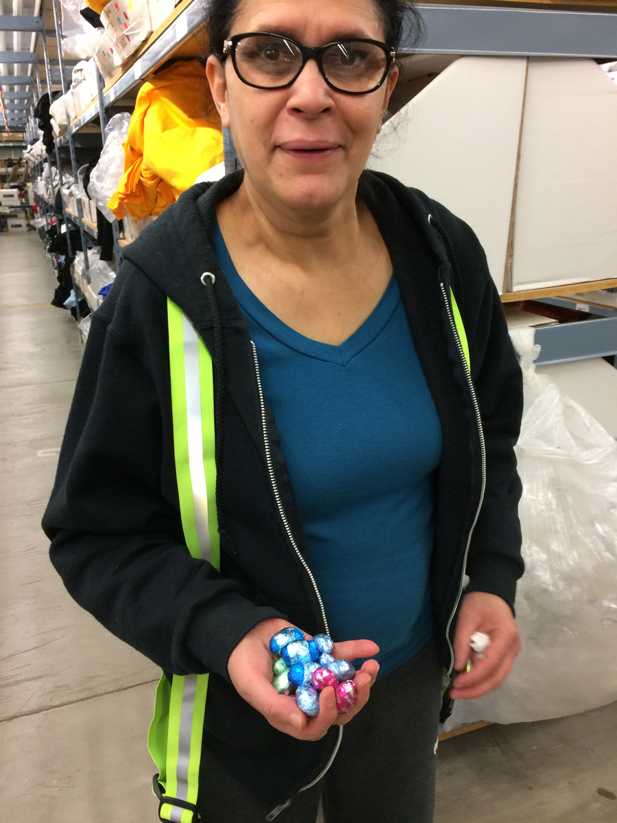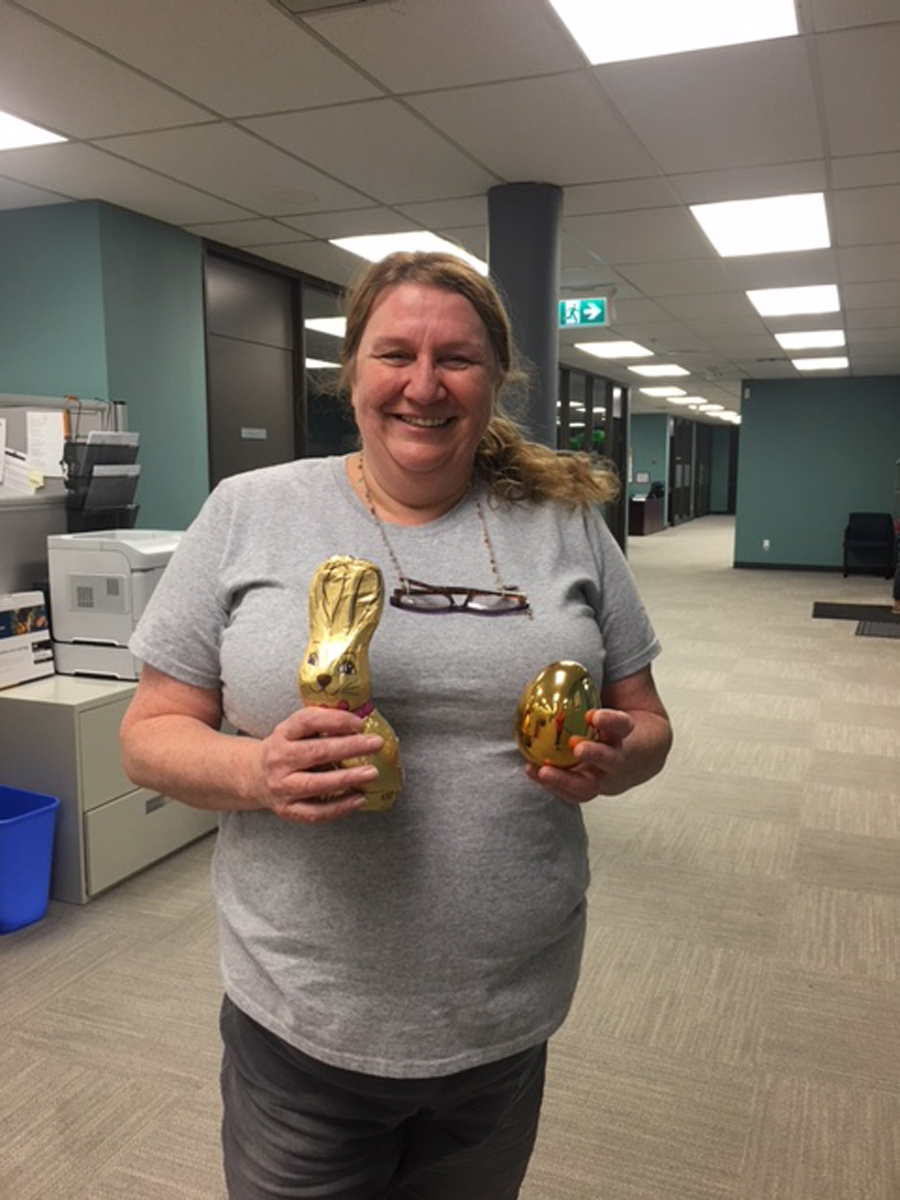 Let’s give a big congratulations to our Lead Shipper in Mississauga, Tegreary McKenzie, and our Bilingual Account Executive in Vancouver, Michele Holland, for finding the golden egg and obtaining the ultimate chocolately prize – a deliciously large chocolate bunny!