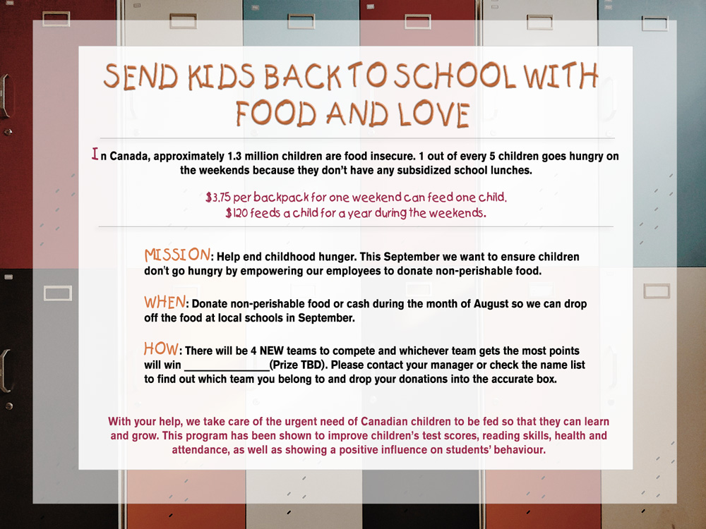 It’s donating time! We want to help end childhood hunger in Canada, and we need your help. For the whole month of August, you can donate non-perishable food and/or cash to help ensure that kids are being fed during the weekends. There will be 4 teams to compete during the month of August, and the winning teams will decide the punishments for the leaders of the losing team: A pie to the face, an ice bucket, or an extreme makeover!